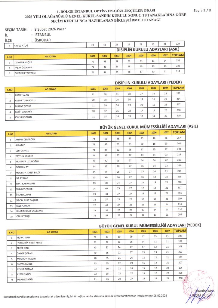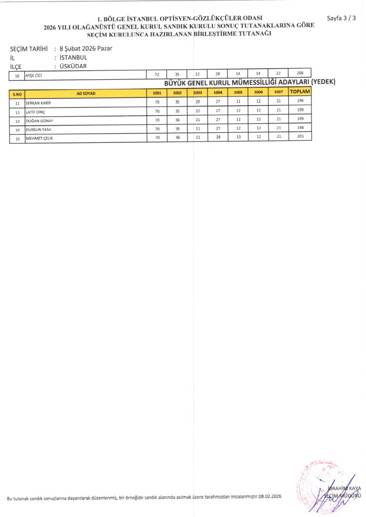 I. Bölge İstanbul Optisyen-Gözlükçüler Odası 2026 Yılı Olağanüstü Genel Kurul Sandık Kurulu Sonuç Tutanaklarına Göre Seçim Kurulunca Hazırlanan Birleştirme Tutanağı doğrultusunda;