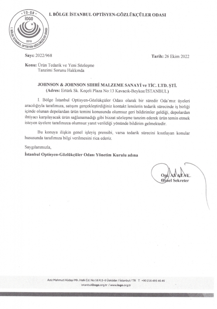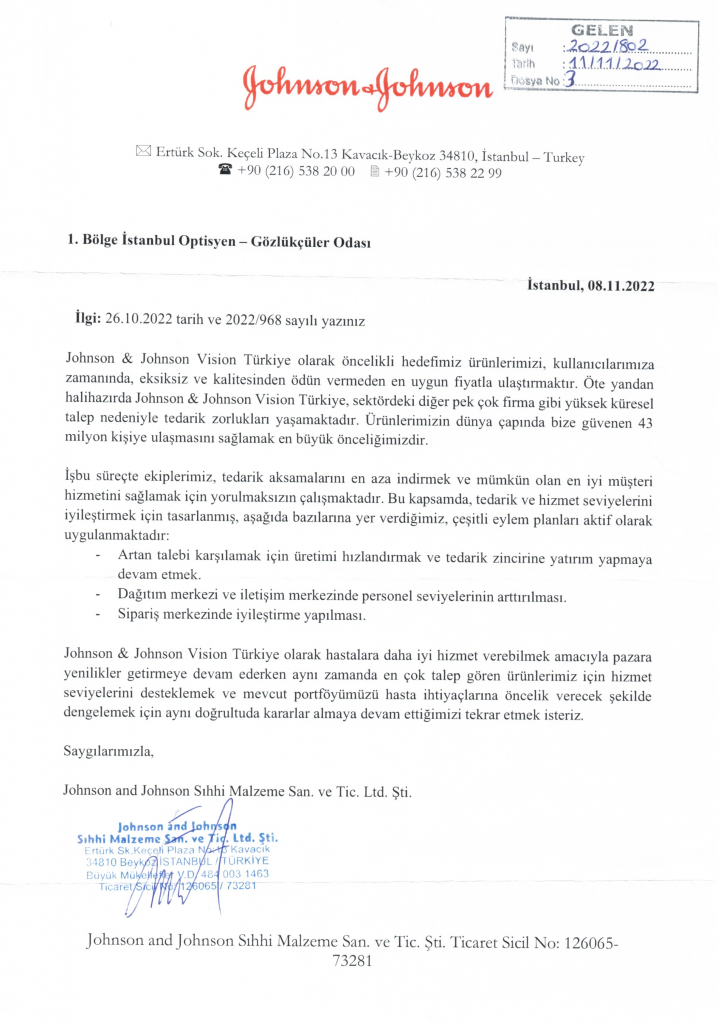 Johnson & Johnson firmasına ait kontak lenslerin tedariki ile ilgili bir süredir sorunlar yaşandığı meslektaşlarımız tarafından Odamıza bildirilmiştir.