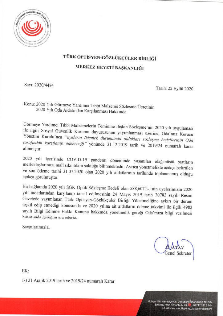 2020 yılı Oda aidatlarının tahsili konusu ile ilgili EK 1’ deki yazımız ile Türk Optisyen-Gözlükçüler Birliğinden görüş istedik. Bu iki hususu uygulamak için Birliğimizden gelen cevap yazısı EK 2 ‘de yer almaktadır.