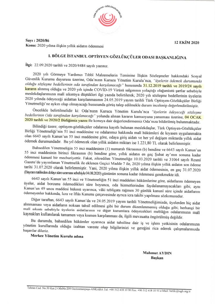 2020 yılı Oda aidatları ile alakalı Oda’mız Kurucu Yönetim Kurulu tarafından “üyelerin ödeyeceği SGK sözleşme bedellerinin Oda tarafından karşılanacağı” yönünde aldığı karar ile ilgili Birliğimiz tarafından 04.01.2020 tarihinde gönderilen yazıda “Birliğimizce yapılacak işlemlere esas olmak ve ilgili mevzuat karşısında hukukî yönden imkânsız ve isabetten uzak görülmekte …” ifadesi yer almaktadır.