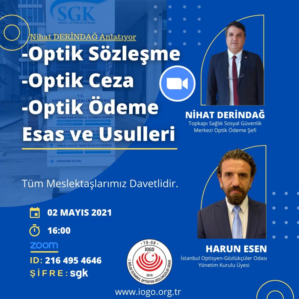 Topkapı SSGM Optik Ödeme Şefi Sayın Nihat DERİNDAĞ ‘ın katılım sağlayacağı, optik sözleşme, ceza, ödeme usul ve esasları hakkında bilgilendirme yapılacak olan bir toplantı düzenlenecektir.