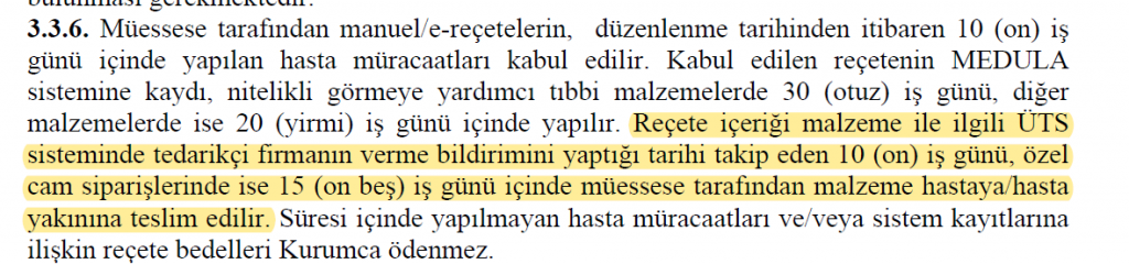1-) Hasta müracaat tarihi ile teslim tarihi arasındaki 10 iş günü, özel cam siparişlerinde 15 iş günü kısıtı olan süre; COVID, karantina gibi sebeplerden dolayı herhangi bir aksama olması durumunda hasta beyanı alınmak koşuluyla aşılabilir şekilde medula optik sistemine girişe izin verilmektedir. Herhangi bir beyan olmadan teslim süresinin aşılarak reçete kaydedilmesi durumunda reçete bedelleri Kurumca ödenmemektedir.