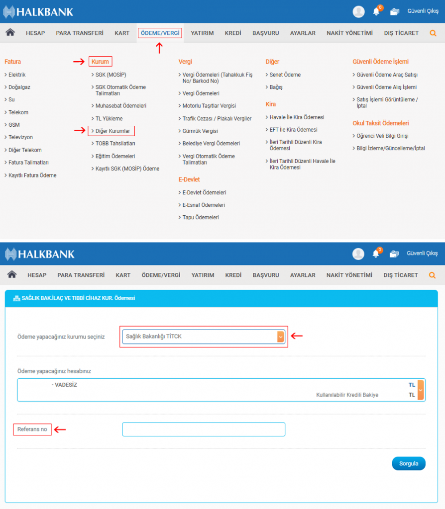 Ödeme Vergi sekmesinden Kurum > Diğer Kurumlar > Sağlık Bakanlığı TİTCK seçilip referans numaranızı girerek işleminizi tamamlayabilirsiniz.
