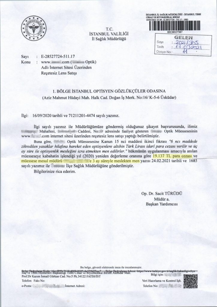 İstanbul İl Sağlık Müdürlüğü ile yapmış olduğumuz resmi yazışmalar sonucunda internet ortamında tüketiciye hitaben reçetesiz kontakt lens satışı yapan bir firmaya 19.137₺ para cezası ve müessese mesul müdürüne 3 ay meslekten men cezası verilmiştir.