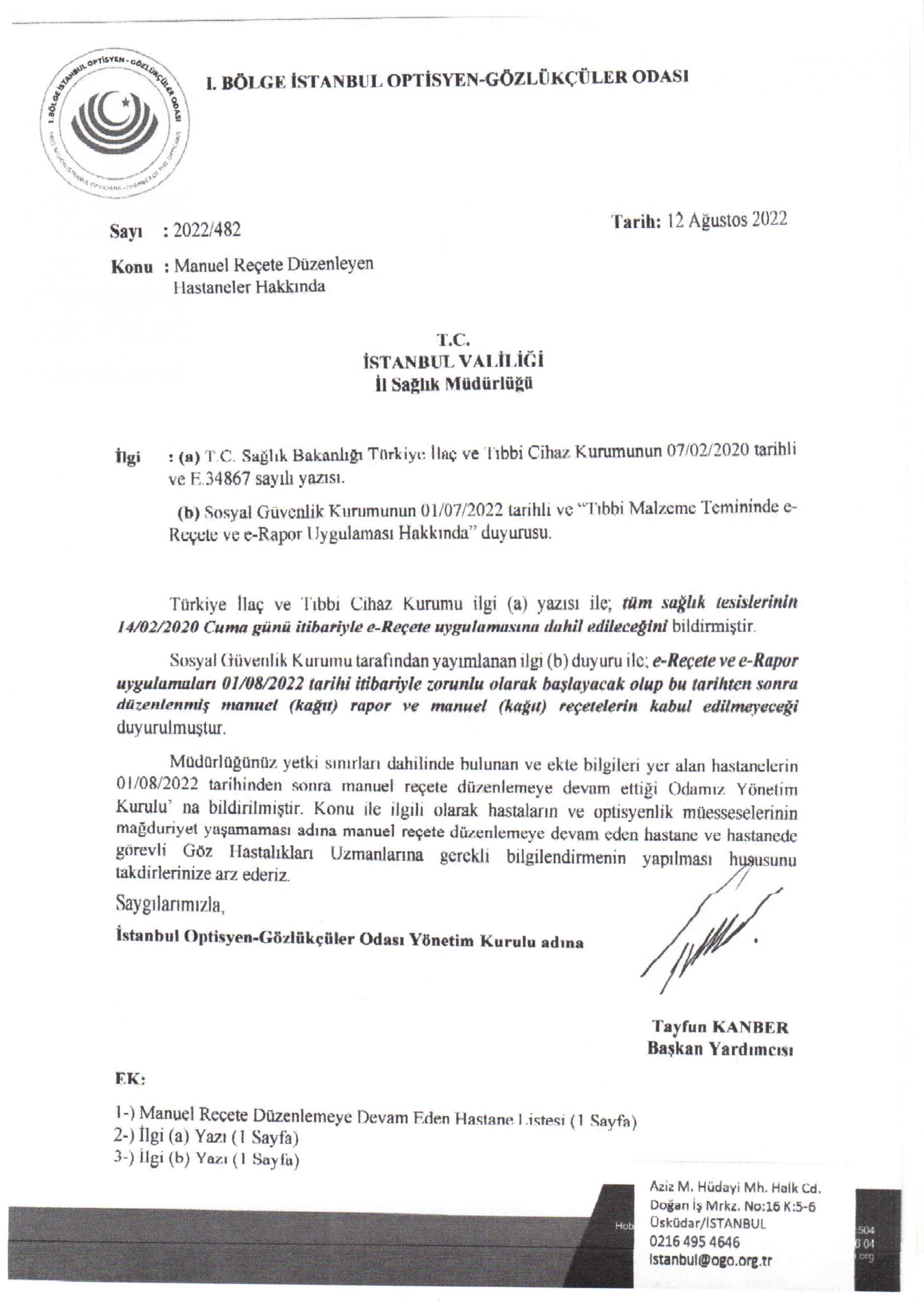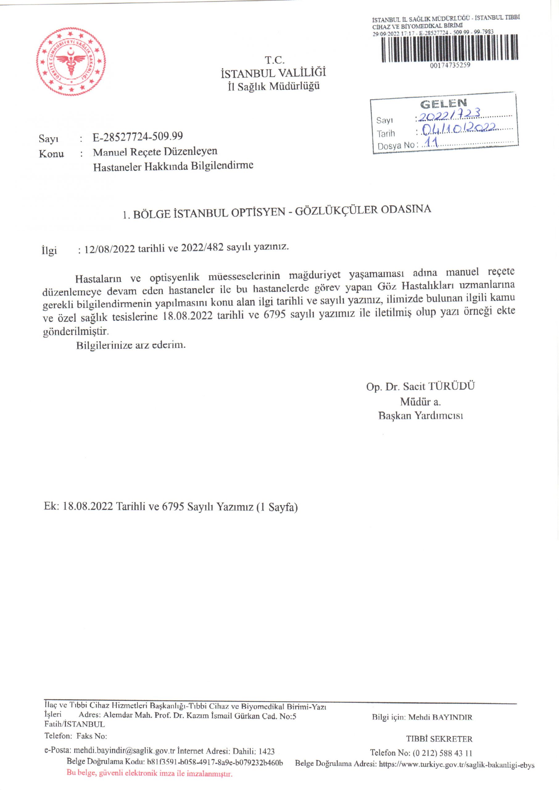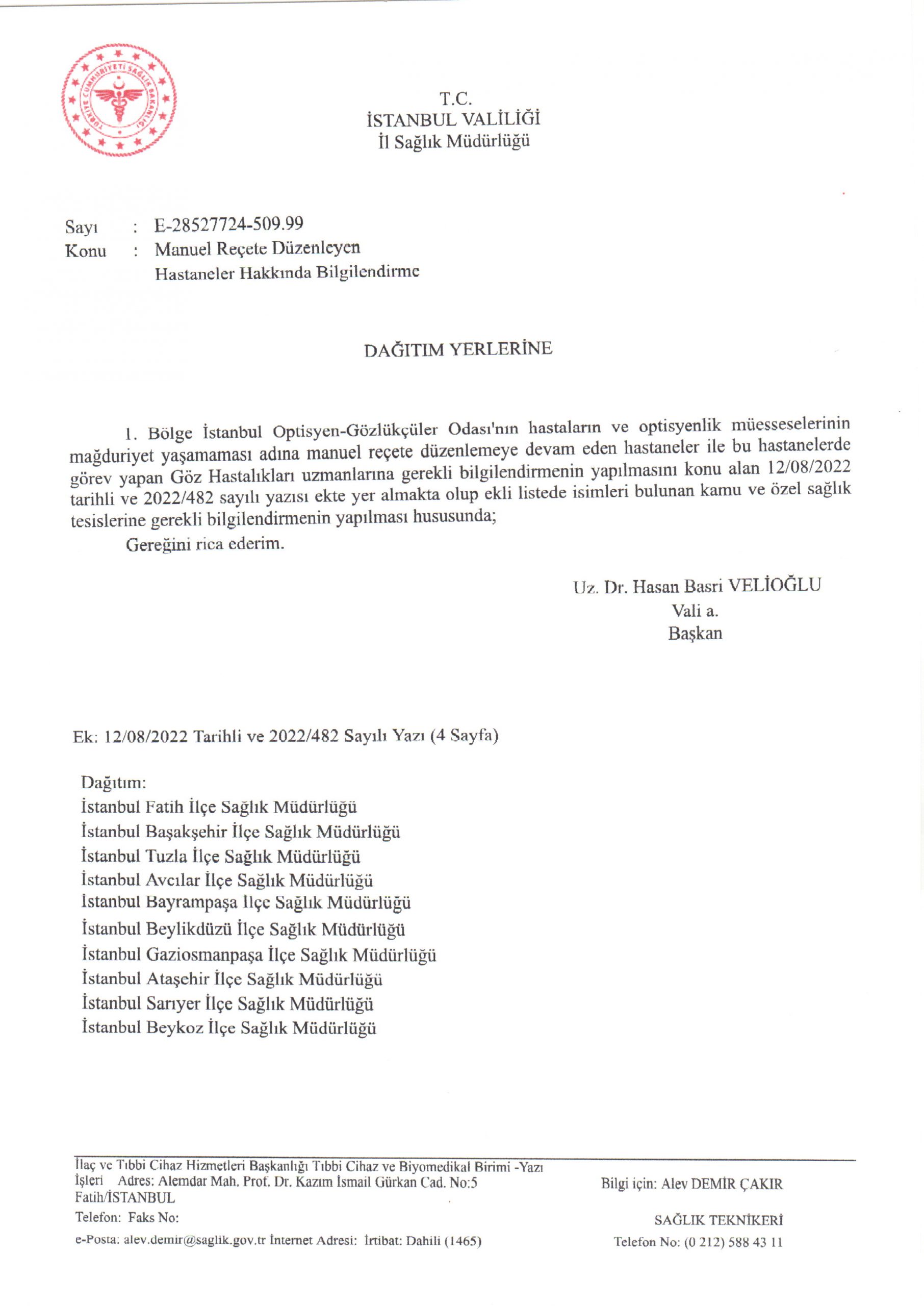 İstanbul İl Sağlık Müdürlüğü; 18/08/2022 tarihli ve E-28527724-509.99 sayılı yazısı ile manuel reçete düzenlemeye devam eden hastaneler ile bu hastanelerde görev yapan Göz Hastalıkları uzmanlarına gerekli bilgilendirmenin yapıldığını bildirmiştir.