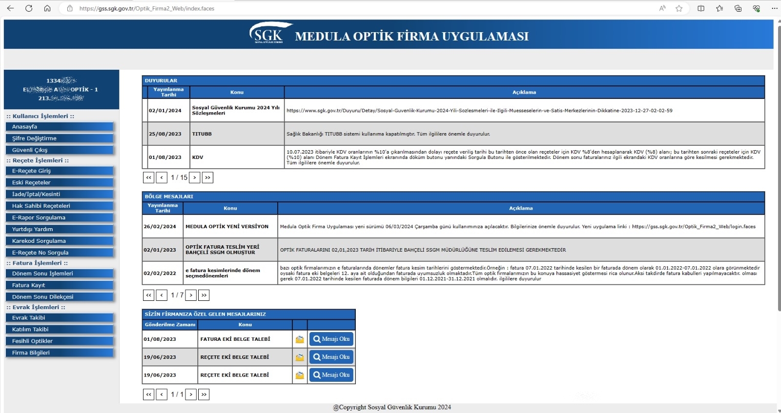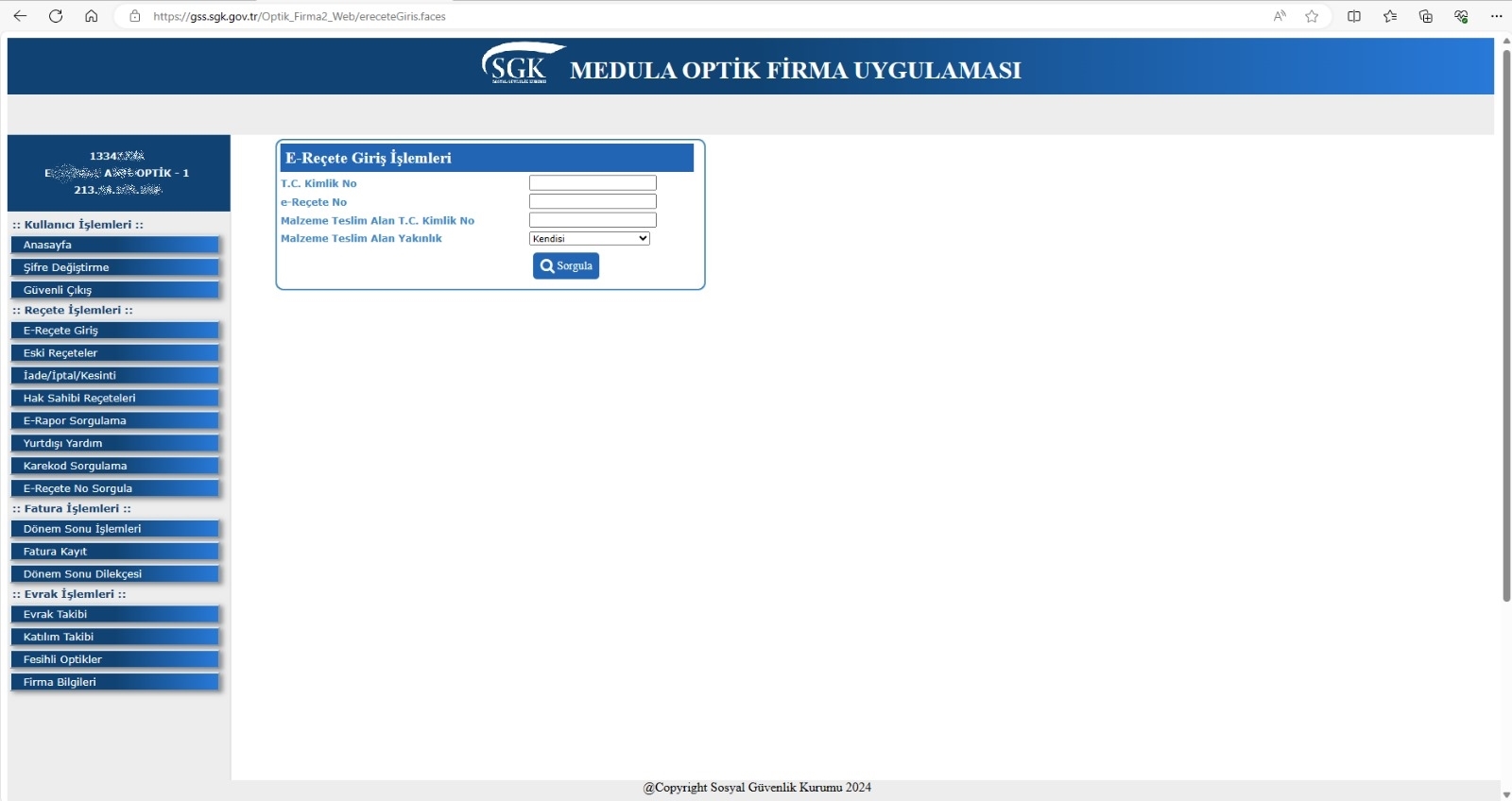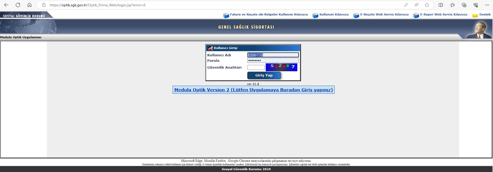 Medula Optik Uygulamasının yeni sürümü bugün (12/03/2024) itibariyle kullanıma açılmıştır. Yeni sürüm için kullanıcı giriş bilgilerinizde bir değişiklik olmayacaktır. Eski giriş bilgilerinize web tarayıcınız üzerinden erişebilirsiniz. Giriş şifrenizi hatırlamamanız halinde şifre yenileme işlemleri için; dilekçe ve şifre yenileme bedelini ödediğinize dair dekont ile birlikte Kuruma başvurmanız gerekecektir.