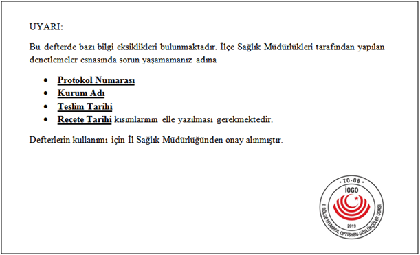 Defterlerde protokol numarası, reçete tarihi, teslim tarihi ve Kurum adı matbu olarak yer almamaktadır. İstanbul İl Sağlık Müdürlüğü ile sağladığımız mutabakat ile eksik bilgiler elle yazılmak suretiyle defterler kullanılabilecektir.